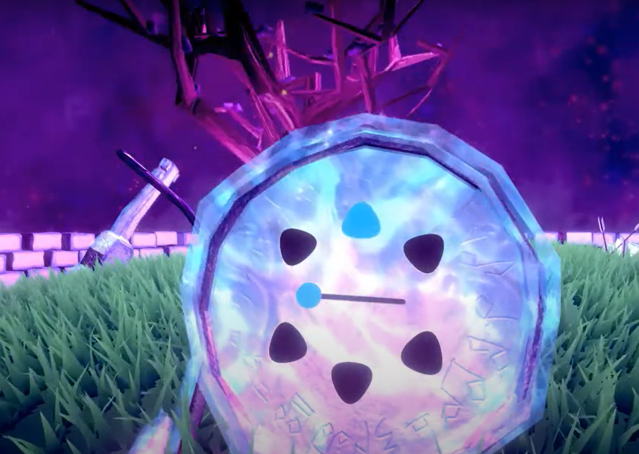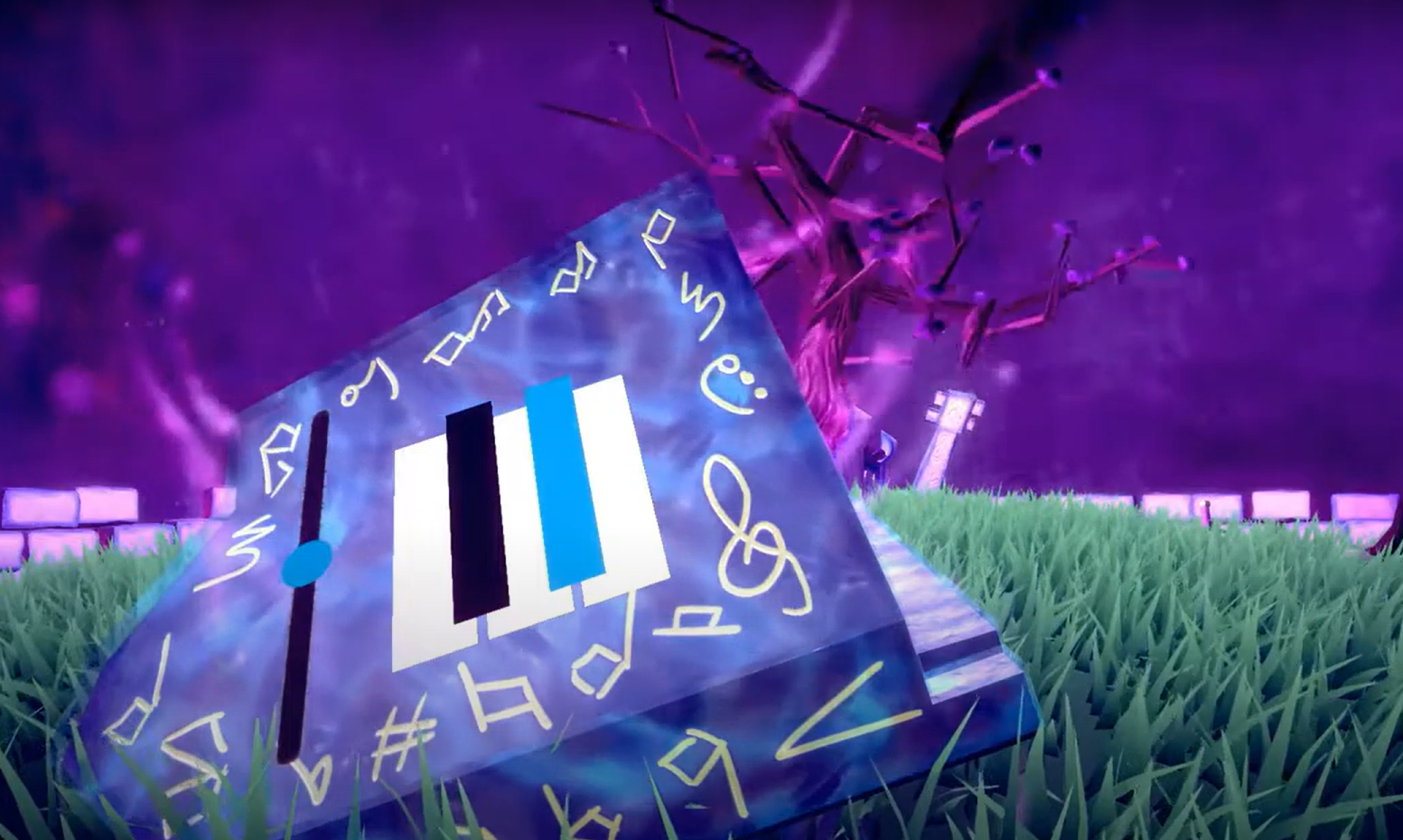 The piano instrument statue with all levels completed (but the final button not pushed). The track and pitch slider are set at the perfect levels and you can see a glowing aura emanating from the piano and floating to the tree.