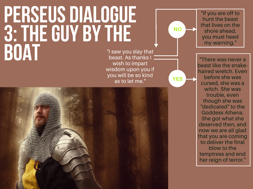 Because our game is supposed to foster empathy, we decided to incorporate perspective-taking in our design. In order to counteract some of the challenges that come with perspective-taking, we chose to first put the player in a common position. By having the player first play as Perseus, they are in a familiar perspective: that of the typical male hero, a character that exhibits the stereotypically masculine traits of strength, arrogance, and a distinct lack of empathy.