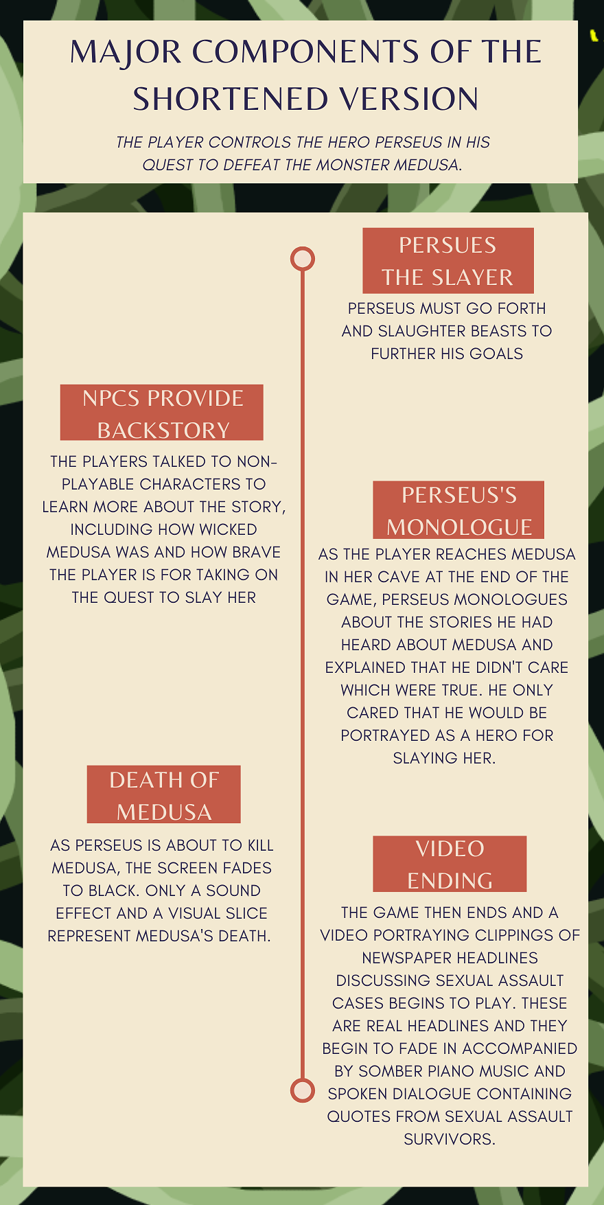 Partway through the game, we then shift the game’s perspective to that of Medusa, with the hopes that having the player take Medusa’s perspective will increase the level at which players empathize with the character, as well as lower rape myth acceptance values (as the player will experience a sexual assault survivor’s perspective).