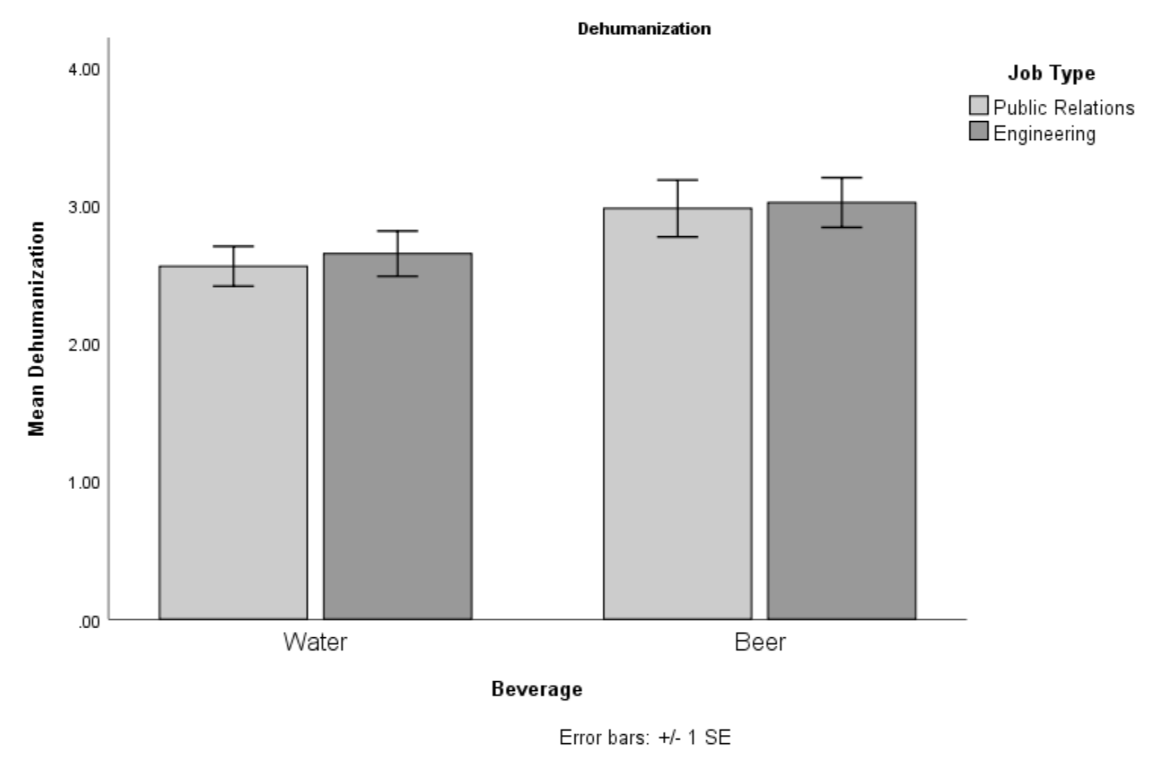 There was not a significant interaction between beverage and job type in regards to dehumanization, F(1, 128) = .02, p =.89, η2p = .00, two-tailed test; professionality, F(1, 128) = .01, p =.93, η2p = .00, two-tailed test; or perceived sexual availability, F(1, 128) = .10, p =.76, η2p = .00, two-tailed test.