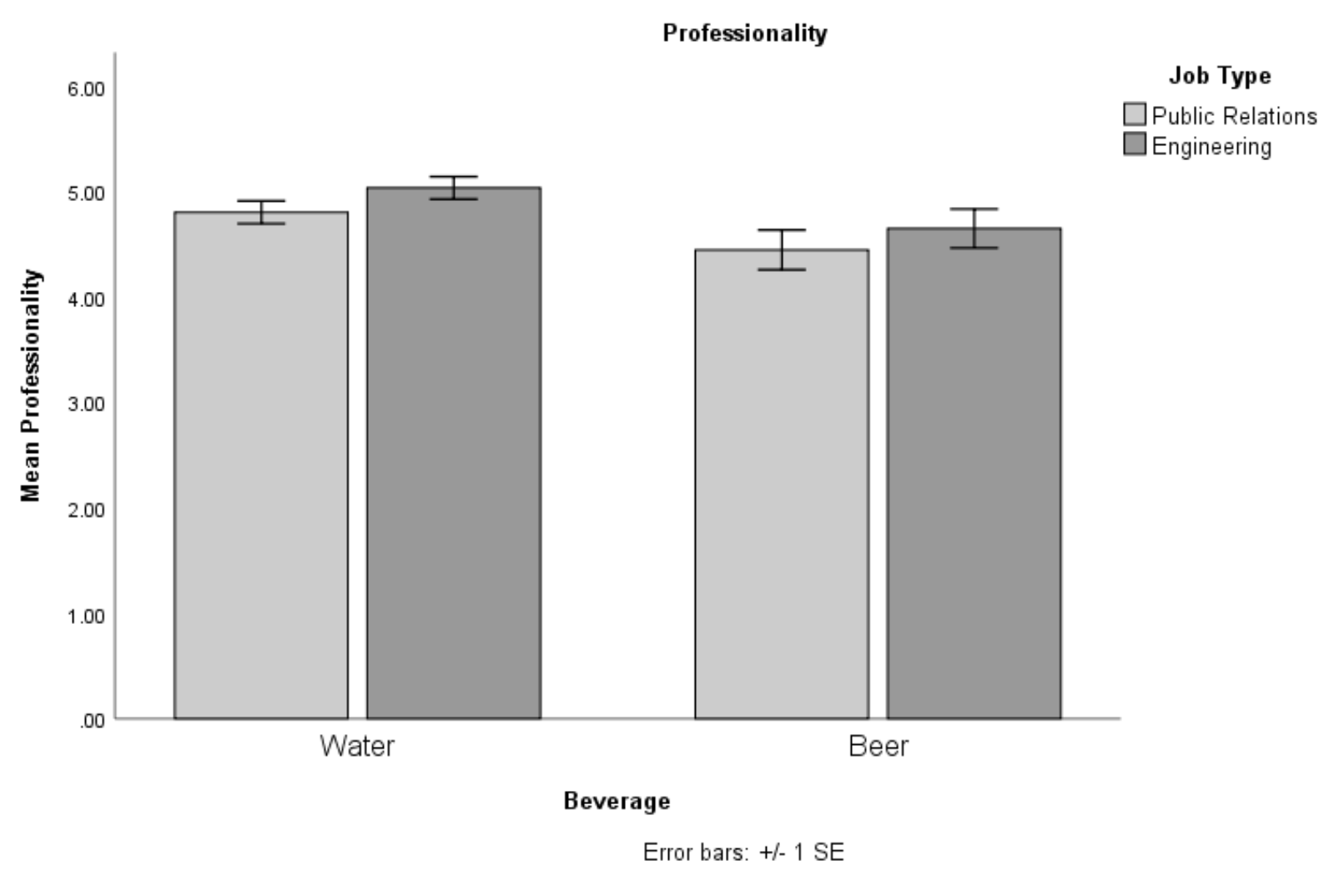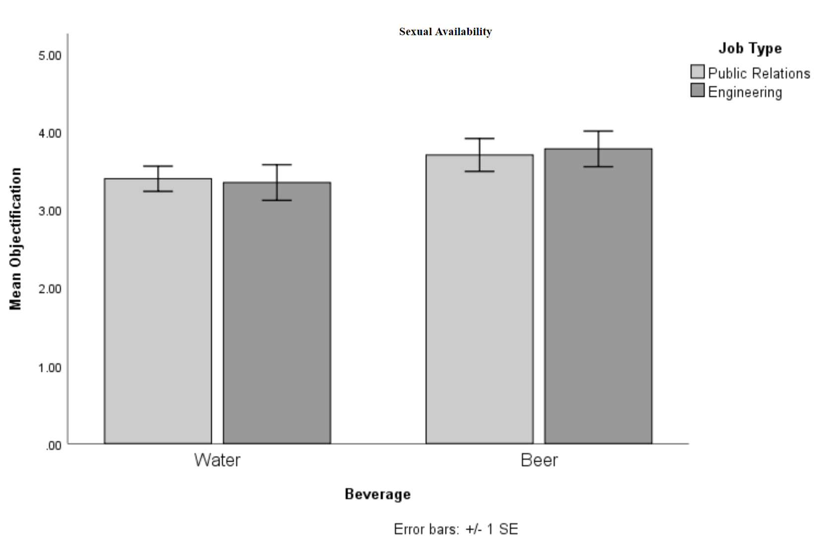 Overall, the results of our study displayed that when examining dehumanization, sexual availability, and professionality, the only significant factor towards participant assessments was whether the candidate was holding a beer or water. While the candidate was shown holding a beer, she was dehumanized more and shown as more sexually available along with less professional then when the candidate was shown holding water. The type of job being applied for did not have any significant impact upon the participants’ assessments of the candidate. There was also not a significant interaction between the type of beverage and job the female candidate was assigned.