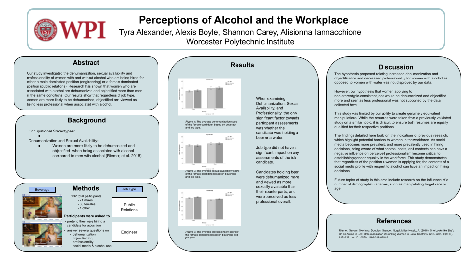 Our study investigated the dehumanization, sexual availability and professionality of women with and without alcohol who are being hired for either a male dominated position (engineering) or a female dominated position (public relations).